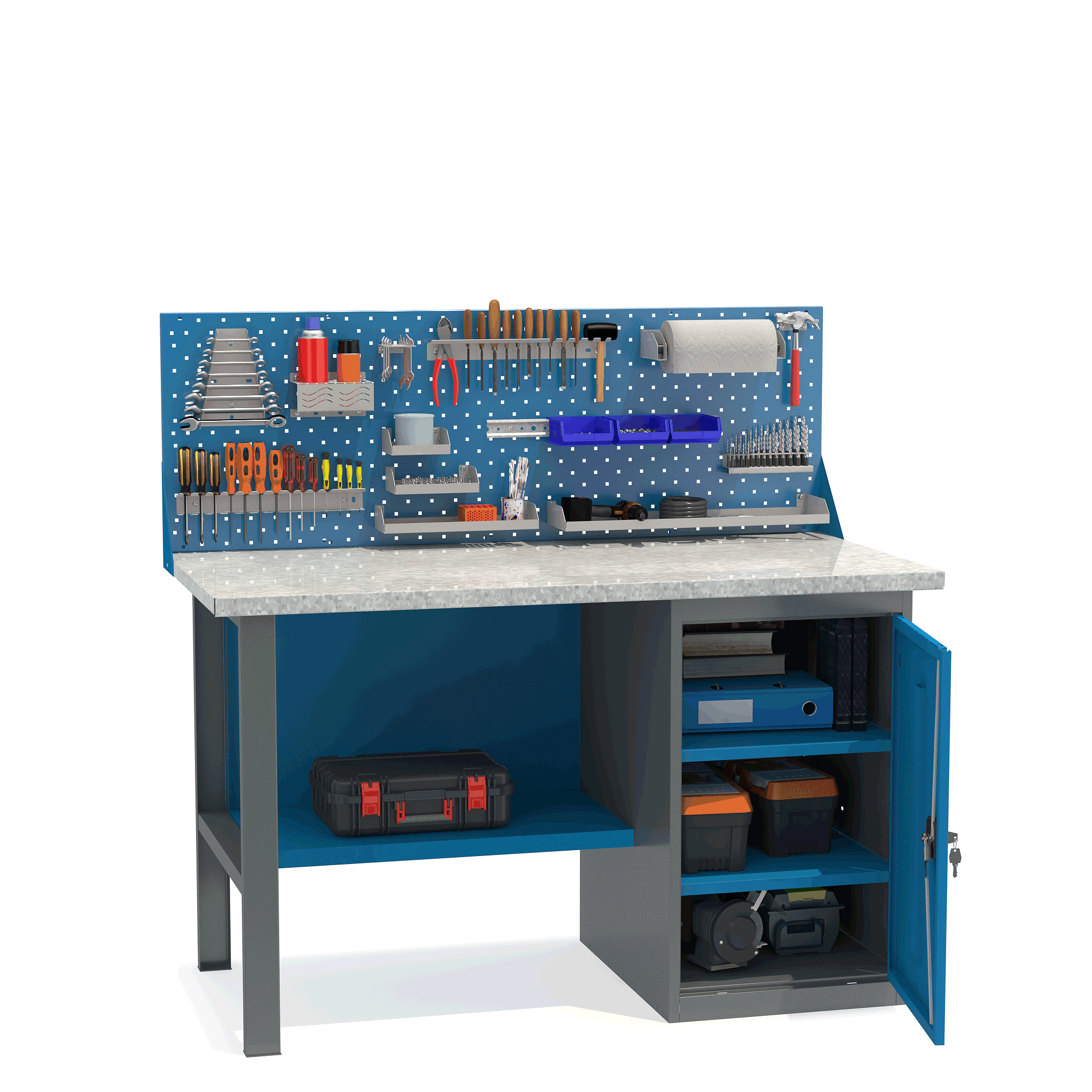 - Верстак укомплектован тумбой с полками.
