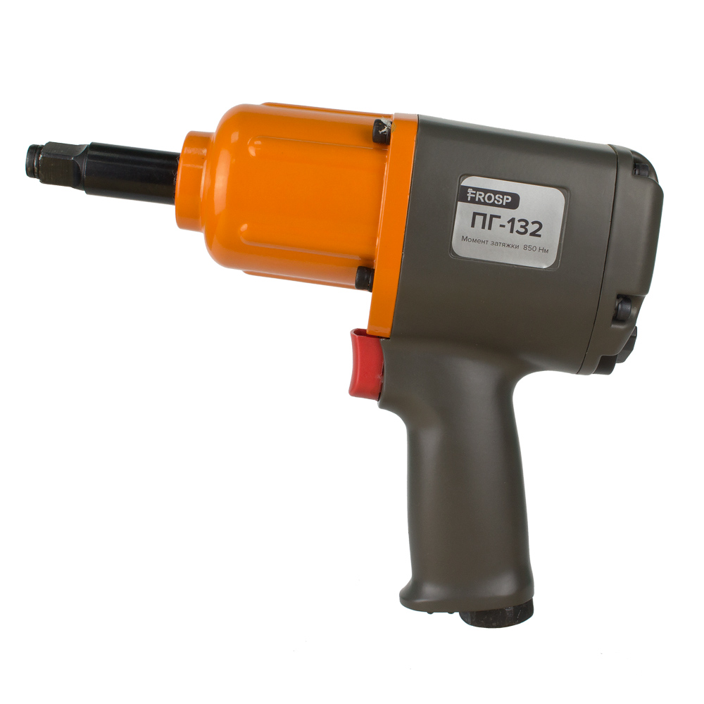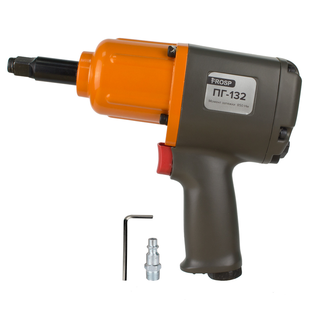 Гайковерт пневматический FROSP ПГ-132 — инструмент, используемый при строительстве, ремонтных и монтажных работах, а также в некоторых видах производственных работ. Удобен в использовании, благодаря эргономичной конструкции, компактным размерам и небольшому весу — всего 3 килограмма. Благодаря этому, может также использоваться в частных хозяйственных нуждах. Квадрат шпинделя у этой модели составляет 1/2 дюйма. Инструмент работает при давлении от 6 до 8 бар. Момент затяжки составляет 850 Нм.